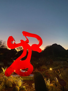 We experienced the art of German French artist Rotraut Klein-Moquay. She is a painter and sculptor that, as the gardens pamphlet explains, "explores the energy of the seasons and the relationship of nature with the sky, sun and universe." Her sculptures are peppered throughout the desert and gleam in a variety of brilliant pigments. The curved, non-objective, towering art is so crisp and slick. They shine, glimmer and it took all of my restraint not to touch the fluid work. The brilliant colors of her artwork contrast the fall neutral color palette of the desert. Step into the gallery to view her paintings, smaller sculptures and tools she uses to create her art. If you are in the area soon, GO! Rotraut's sculptures and paintings will be on display until May 14, 2023.